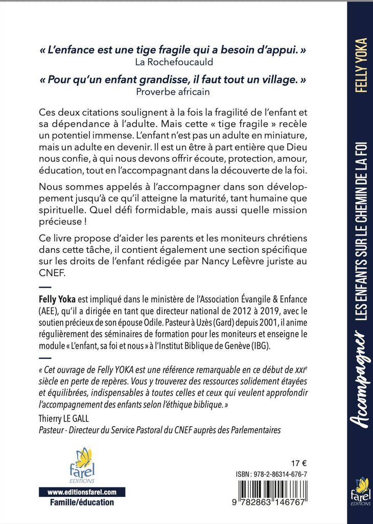 « Cet ouvrage de Felly YOKA est une référence remarquable en ce début de XXIe siècle en perte de repères. Vous y trouverez des ressources solidement étayées et équilibrées, indispensables à toutes celles et ceux qui veulent approfondir l’accompagnement des enfants selon l’éthique biblique. »